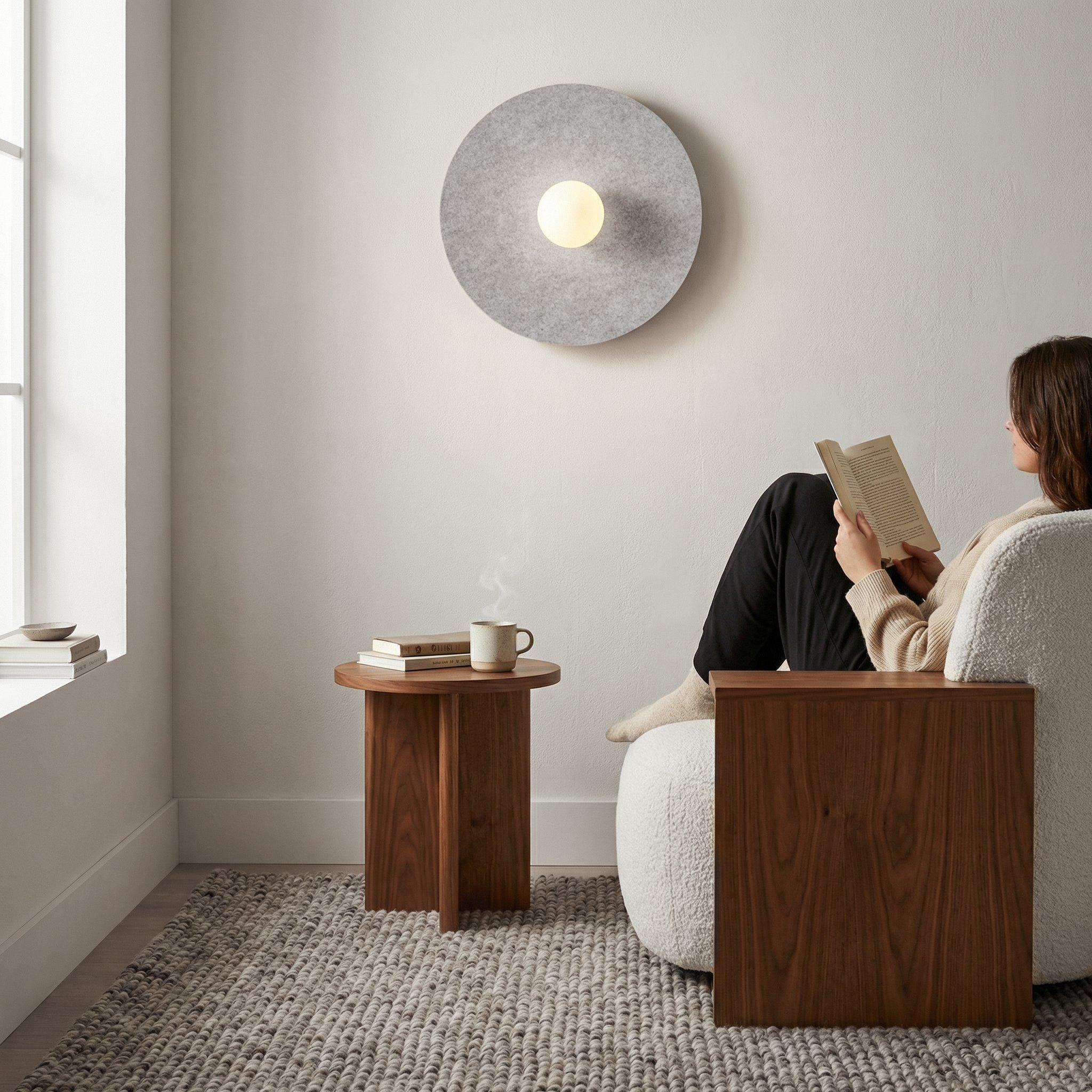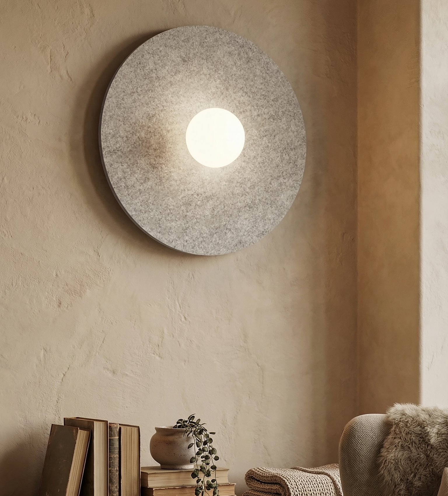 Kinkiet CALMA wprowadza organiczne ciepło do każdego wnętrza dzięki miękkiemu, zaokrąglonemu kloszowi wykonanemu z naturalnego filcu. Ta elegancka oprawa zapewnia łagodne, nastrojowe oświetlenie, a filcowe wykończenie dodaje wyrafinowanej tekstury, idealnej do sypialni, korytarzy lub przestrzeni w stylu skandynawskim.