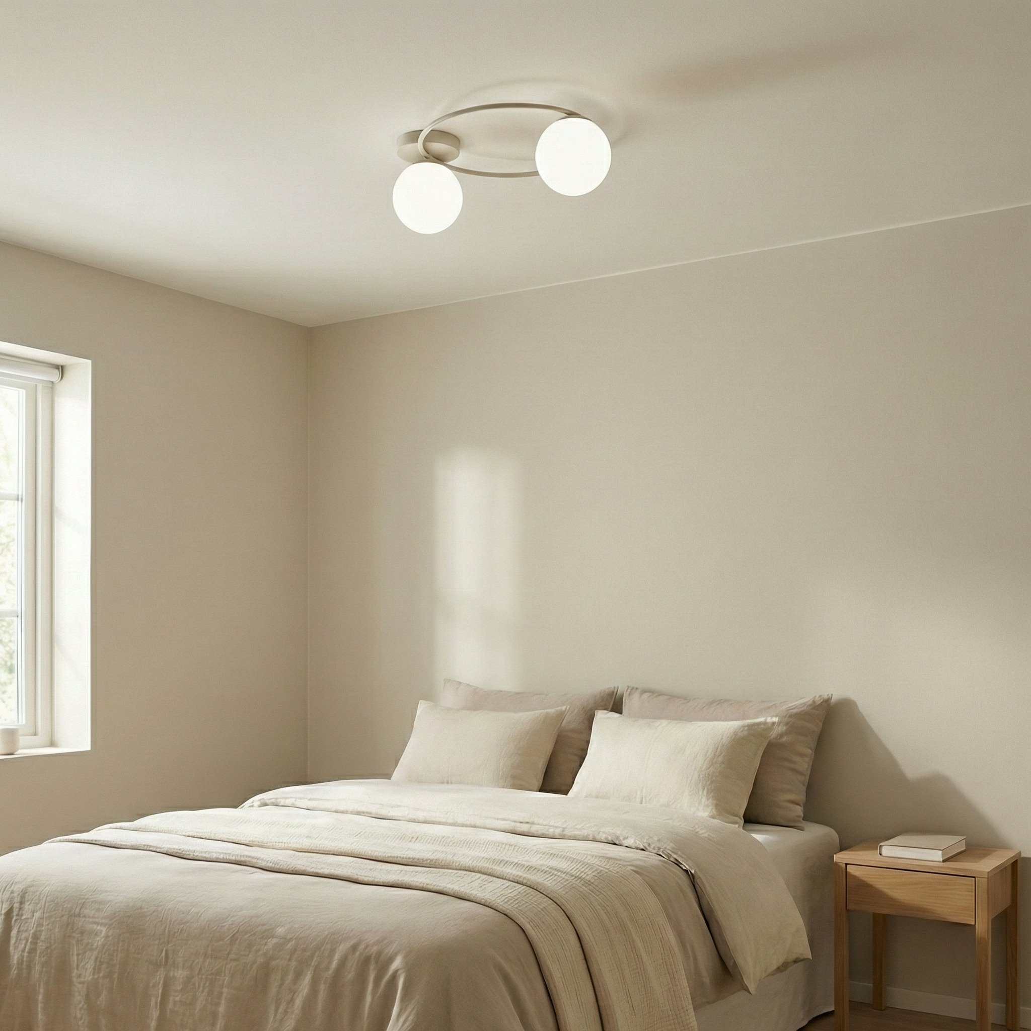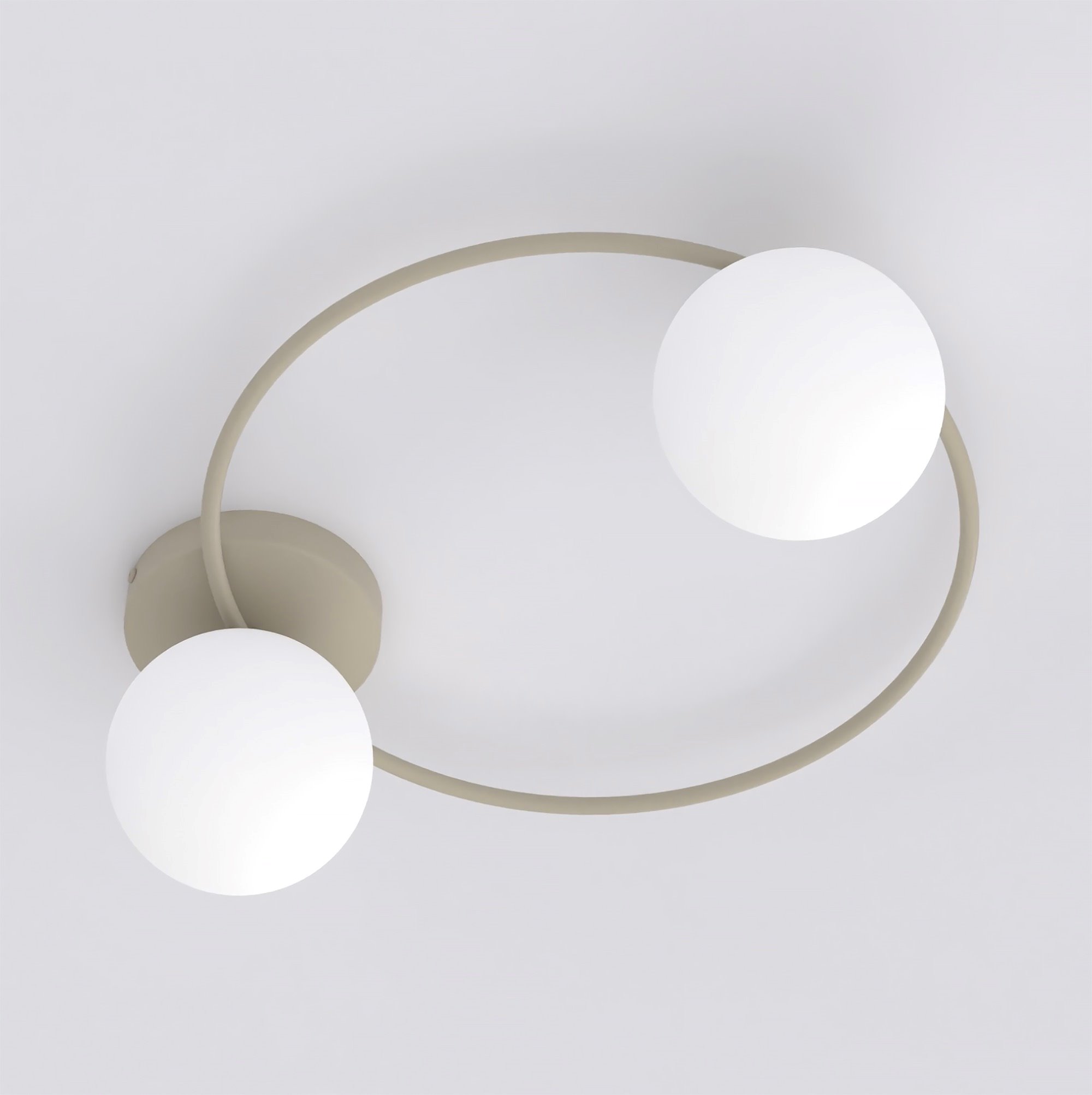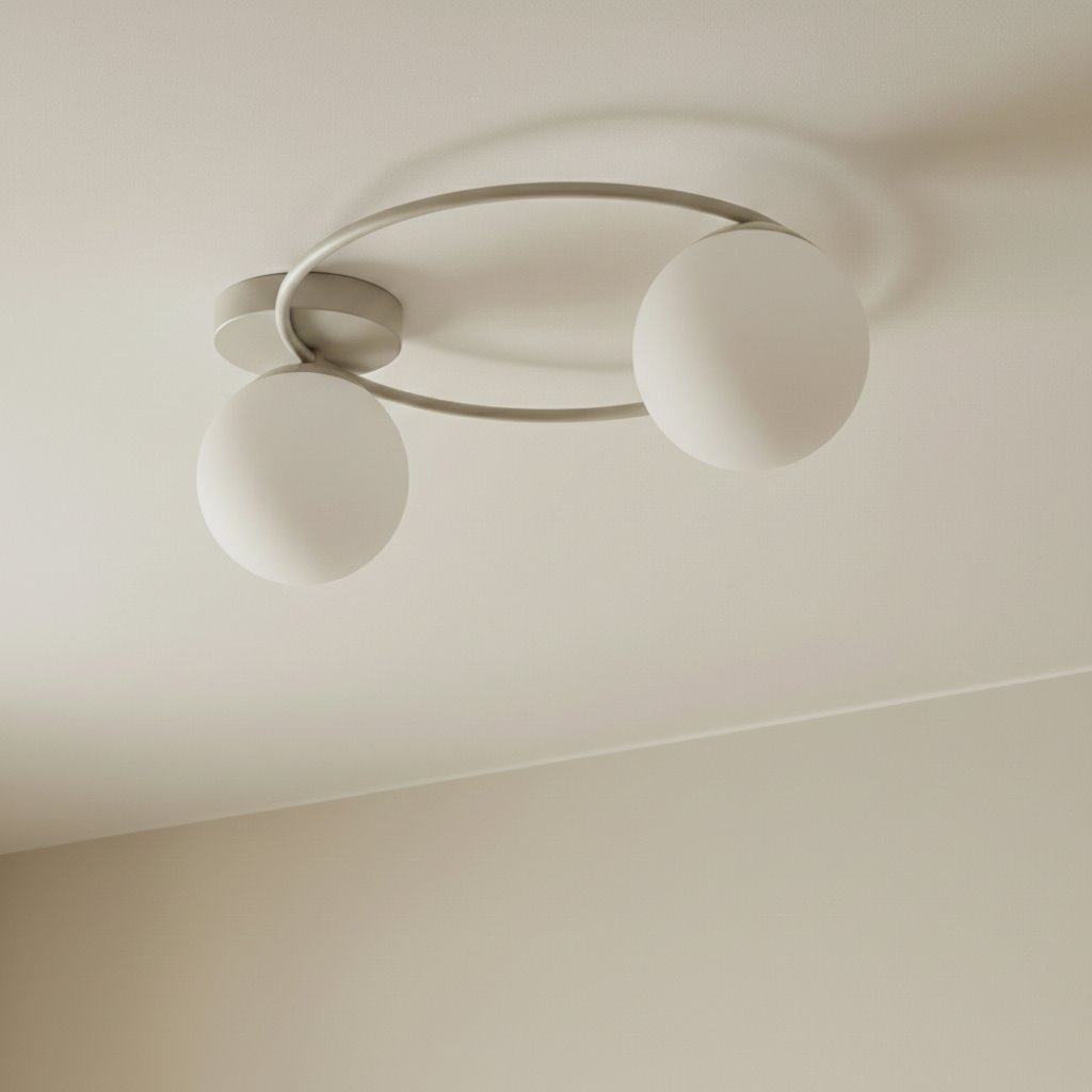Lampa sufitowa SOPRA to nowoczesna interpretacja oświetlenia geometrycznego, łącząca okrągłą ramę z eleganckimi szklanymi kulami. Minimalistyczny design i ciepłe odcienie kloszy zapewniają miękkie, wielokierunkowe światło, co czyni ją stylowym wyborem do nowoczesnych salonów, sypialni lub przedpokojów z niskim sufitem.
