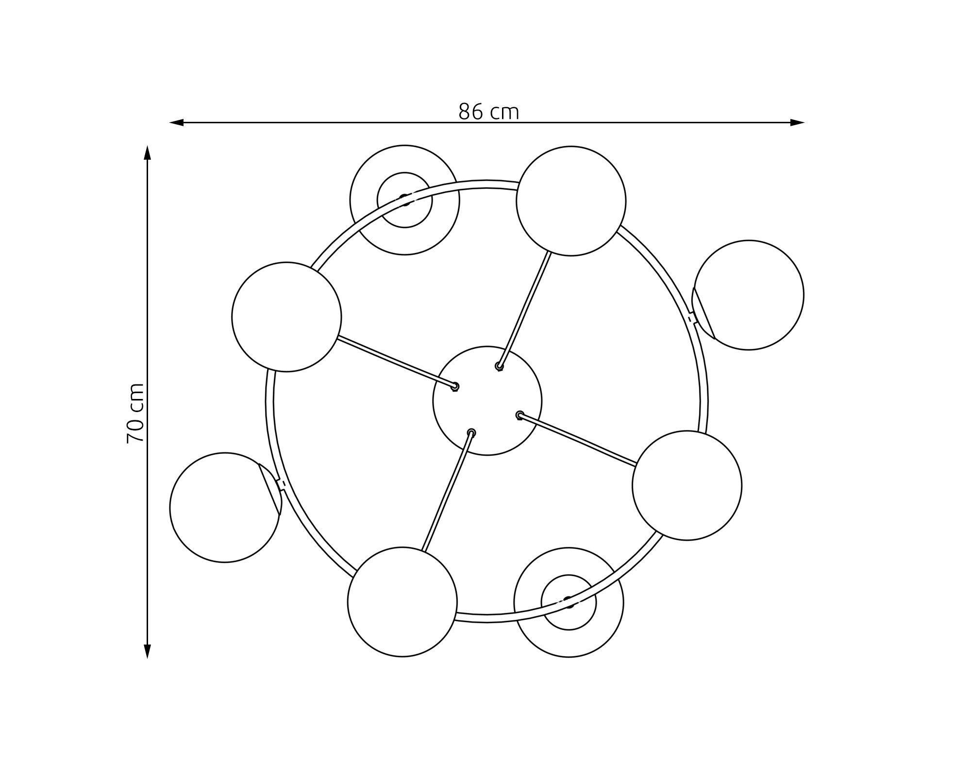 Lampa wisząca AZURA to efektowny, nowoczesny żyrandol w formie okręgu ozdobionego szklanymi kulami. Jej elegancki, symetryczny design zapewnia harmonijne rozproszenie światła, co czyni ją idealnym punktem centralnym nad dużym stołem w jadalni, w przestronnym salonie lub nowoczesnym lobby hotelowym.