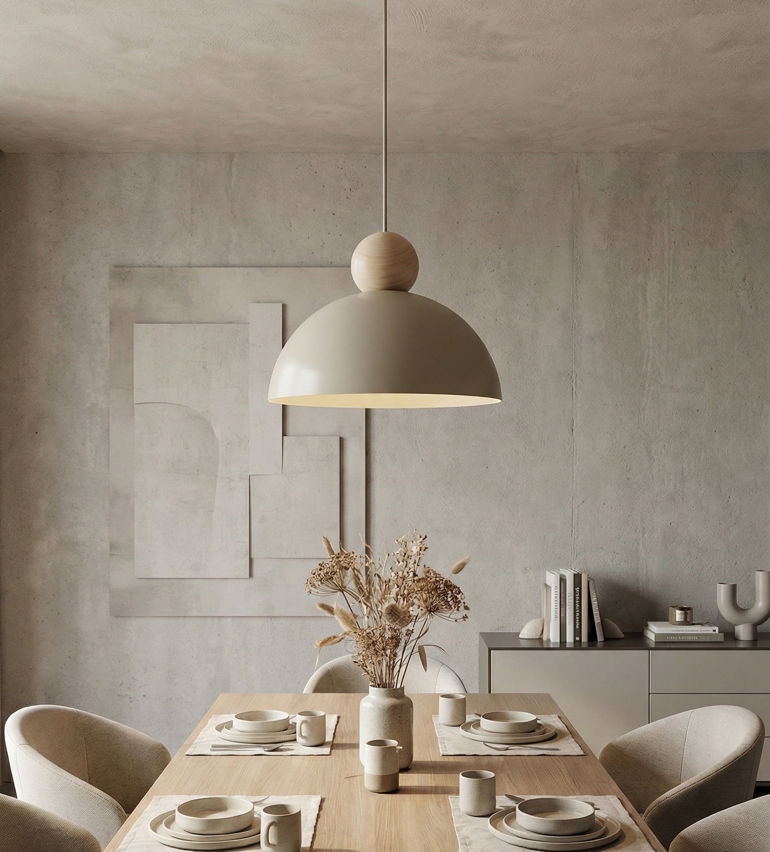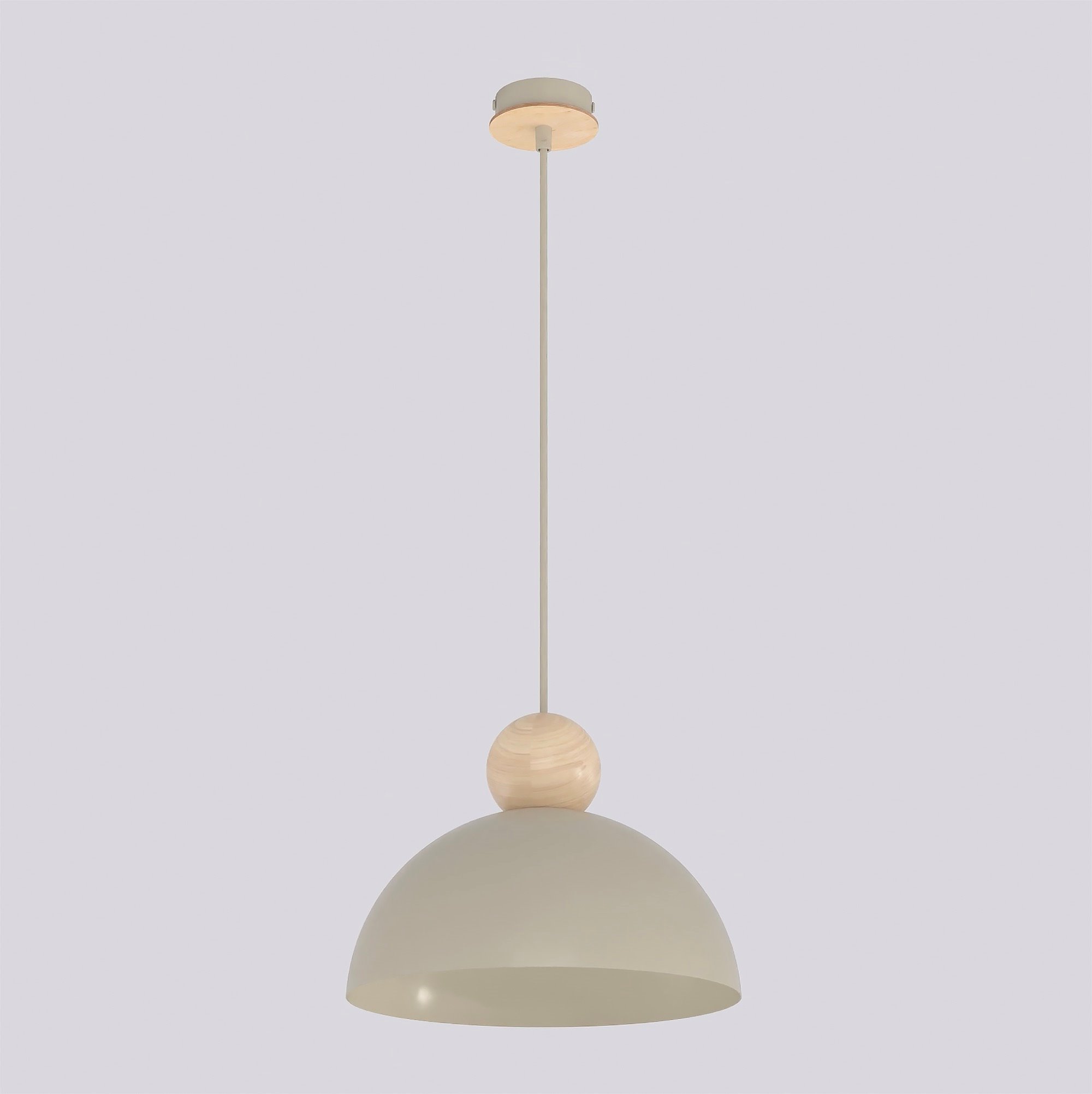 Nowoczesna lampa wisząca o minimalistycznym designie, łącząca matowy kolor z naturalnym akcentem drewna. Półkolisty klosz zapewnia przyjemne, rozproszone światło, a dekoracyjna drewniana kula dodaje wnętrzu ciepła i elegancji. Idealna do jadalni, salonu lub nowoczesnej kuchni, doskonale wpisuje się w aranżacje skandynawskie i loftowe.