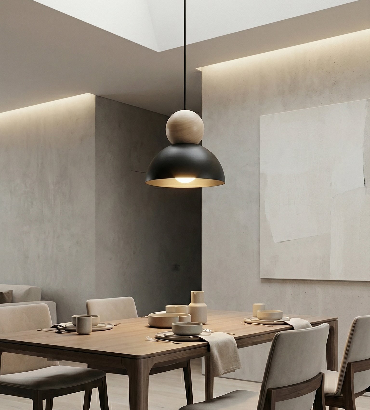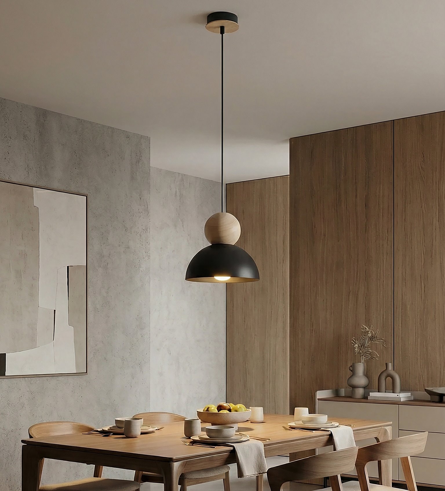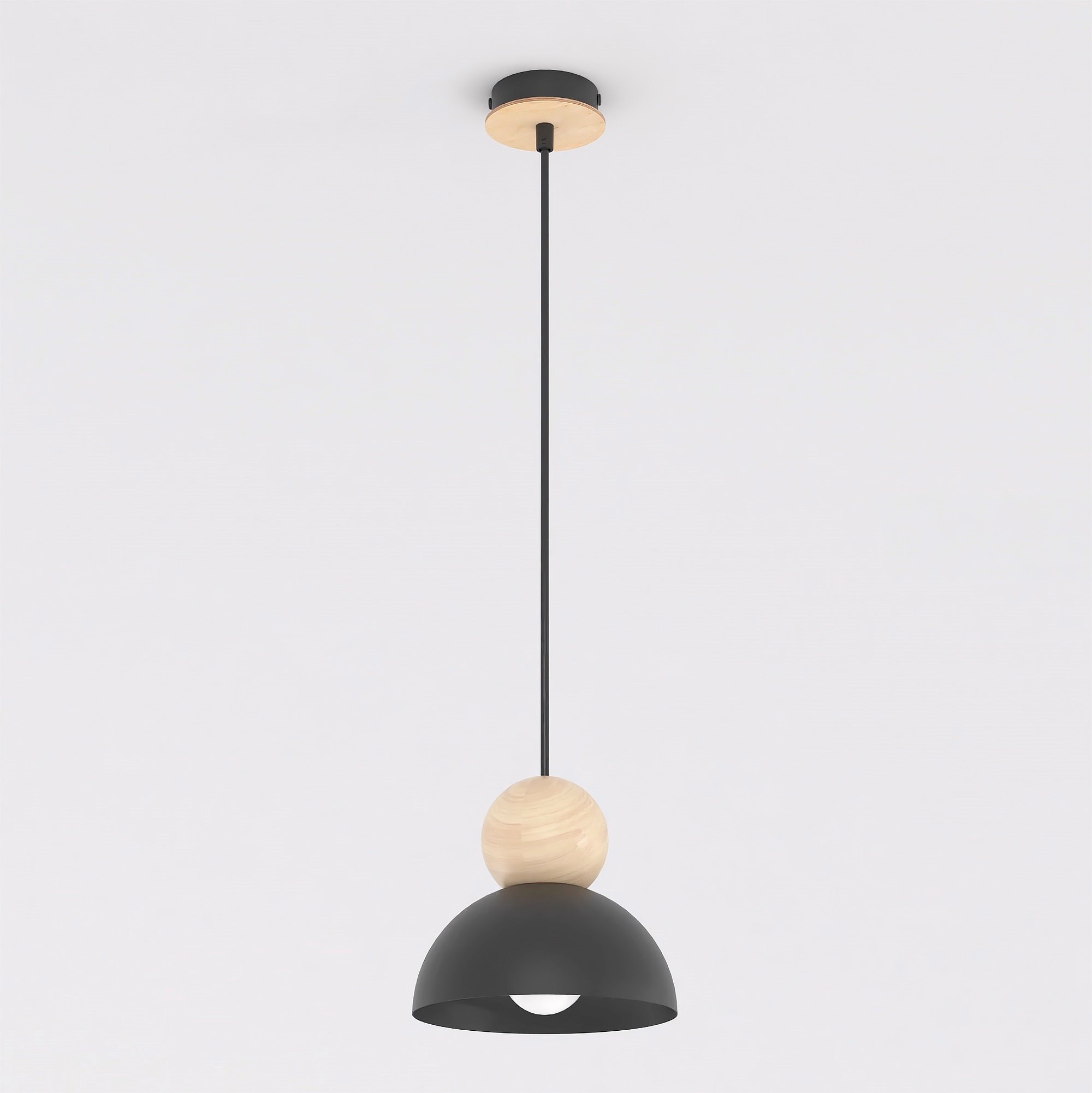 Nowoczesna lampa wisząca o minimalistycznym designie, łącząca matowy kolor z naturalnym akcentem drewna. Półkolisty klosz zapewnia przyjemne, rozproszone światło, a dekoracyjna drewniana kula dodaje wnętrzu ciepła i elegancji. Idealna do jadalni, salonu lub nowoczesnej kuchni, doskonale wpisuje się w aranżacje skandynawskie i loftowe.