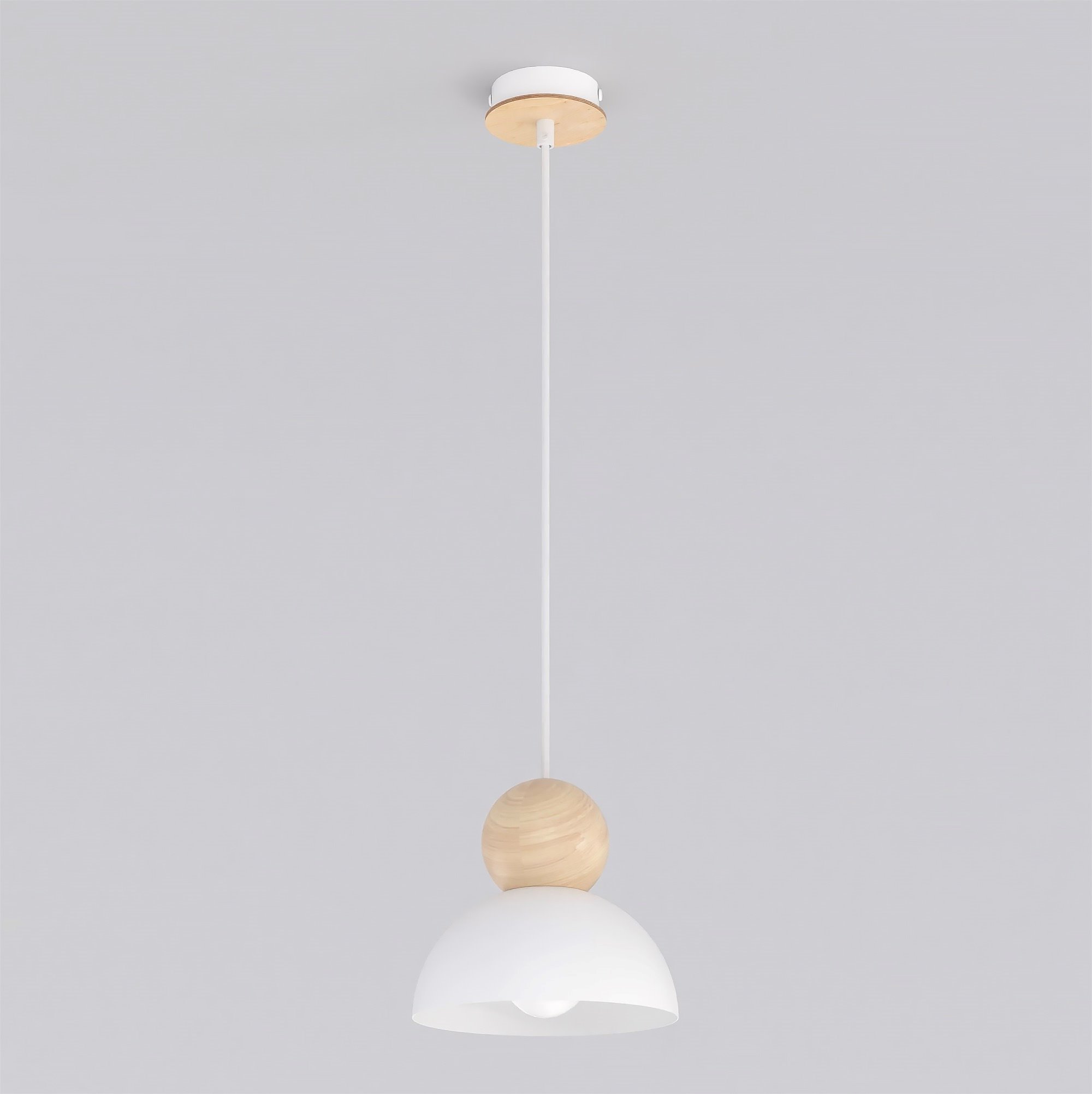 Nowoczesna lampa wisząca o minimalistycznym designie, łącząca matowy kolor z naturalnym akcentem drewna. Półkolisty klosz zapewnia przyjemne, rozproszone światło, a dekoracyjna drewniana kula dodaje wnętrzu ciepła i elegancji. Idealna do jadalni, salonu lub nowoczesnej kuchni, doskonale wpisuje się w aranżacje skandynawskie i loftowe.