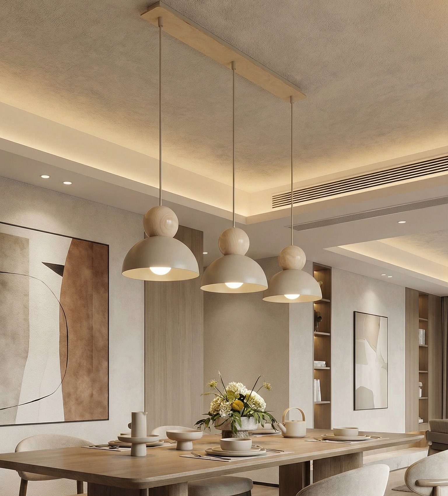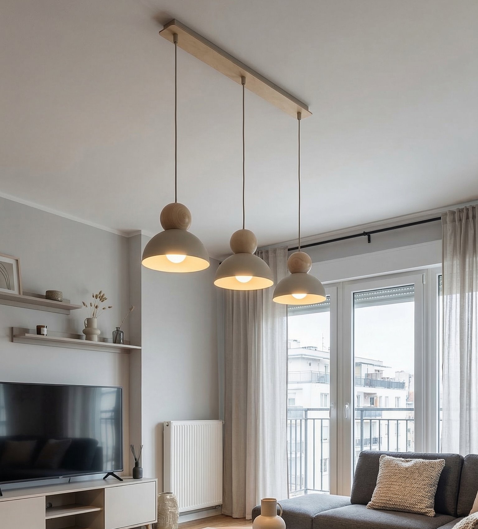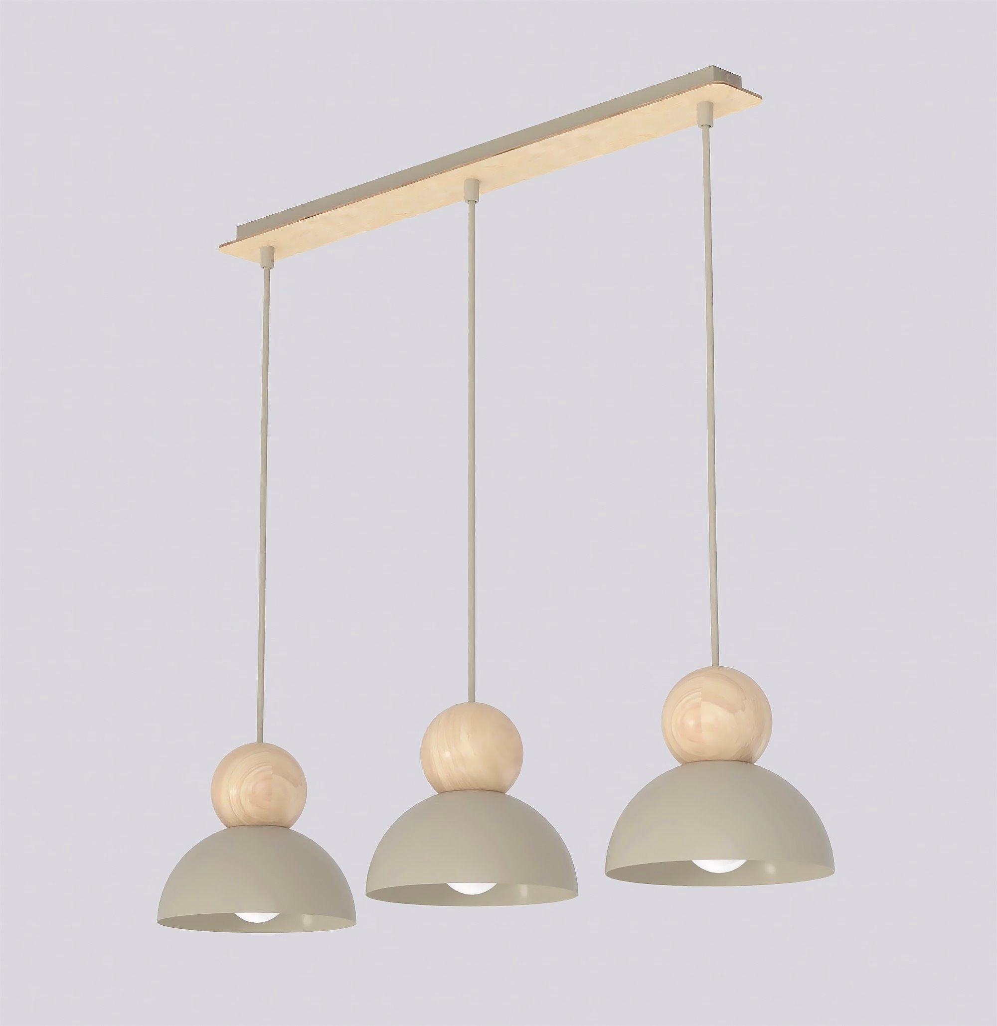 Nowoczesna lampa wisząca o minimalistycznym designie, łącząca matowy kolor z naturalnym akcentem drewna. Półkolisty klosz zapewnia przyjemne, rozproszone światło, a dekoracyjna drewniana kula dodaje wnętrzu ciepła i elegancji. Idealna do jadalni, salonu lub nowoczesnej kuchni, doskonale wpisuje się w aranżacje skandynawskie i loftowe.