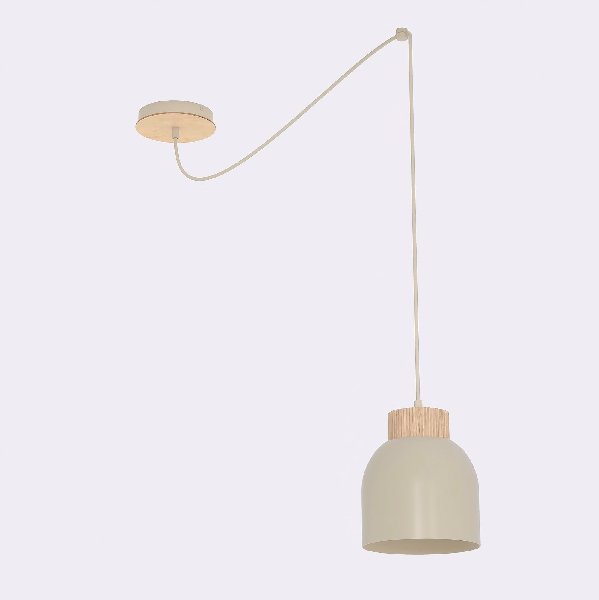 Lampa wisząca KRU to projekt inspirowany stylem skandynawskim, łączący matowy metalowy klosz z ciepłymi drewnianymi akcentami. Unikalne zawieszenie typu "pająk" pozwala na elastyczne ustawienie światła, co czyni ją idealnym rozwiązaniem funkcjonalnym i dekoracyjnym do nowoczesnych salonów, sypialni lub minimalistycznych biur.