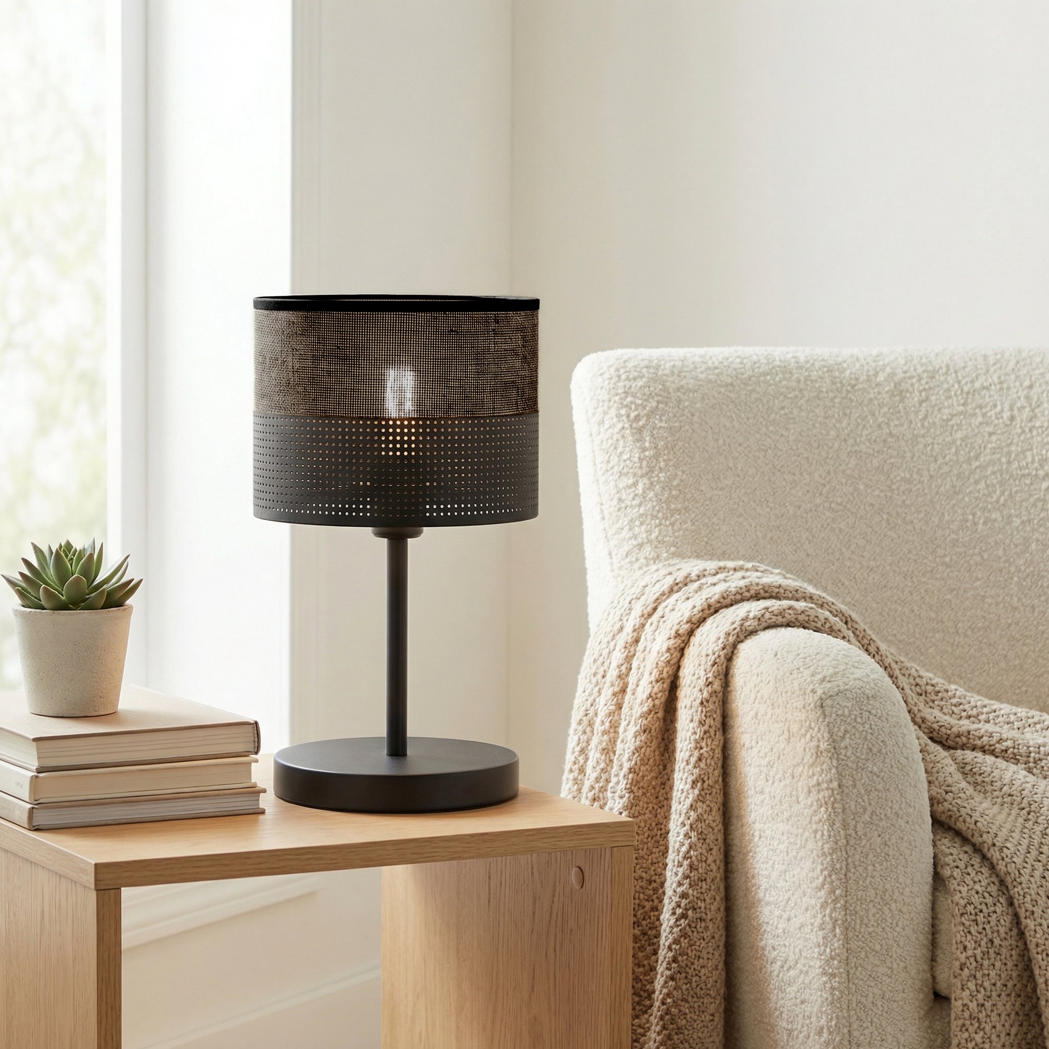 Lampa stołowa LUX to minimalistyczne dzieło sztuki, charakteryzujące się smukłą, cylindryczną metalową obudową na dopasowanej geometrycznej podstawie. Zaprojektowana z myślą o stylu i funkcjonalności, zapewnia precyzyjne oświetlenie zadaniowe o nowoczesnym charakterze, co czyni ją idealnym wyborem na biurka, stoliki nocne lub minimalistyczne komody.